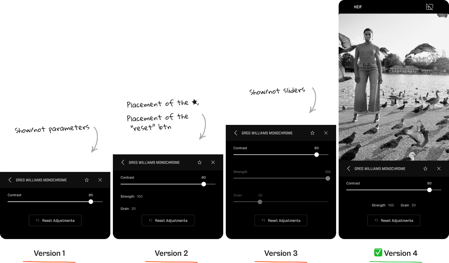 I always design multiple versions of the same UI and have internal discussions about them. For example, for this filter I defined how much information we should display, especially when it's not editable by the user. So if the strenght and grain of the filter can't be edited, should we show them anyways, and what will they look like? In this case, I chose to break the convention and to not display sliders when those parameters are not editable.