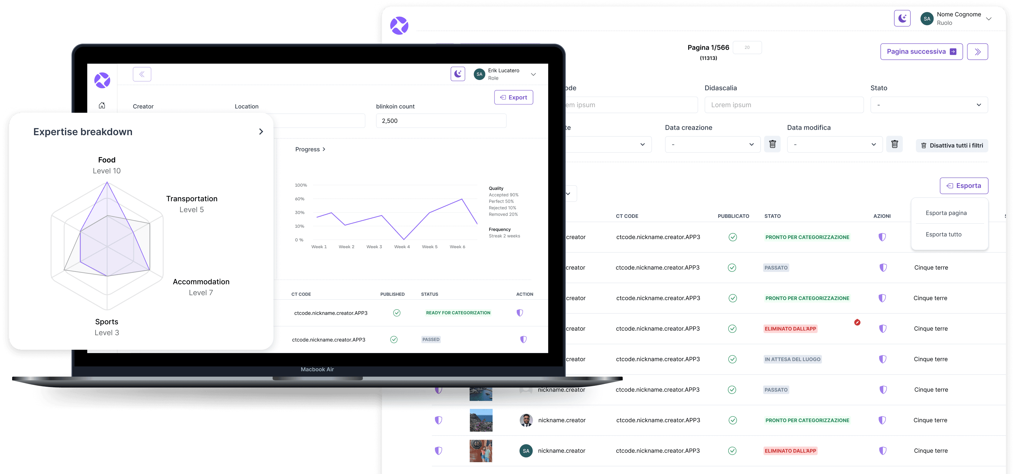 The backoffice experience gives an overview of all videos uploaded into the platform, which moderators can then categorize and check. Each creator has their own statistics, with a breakdown into their expertise.